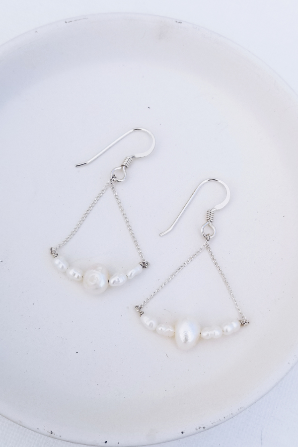 A soft arc of pearls rests along a delicate chain, creating a gentle, balanced silhouette that feels easy from the moment you put them on. Their lightweight design offers a barely-there feel, while the subtle movement adds a touch of quiet elegance. Simple, refined, and crafted with purpose, these earrings bring a serene touch to your everyday style—while helping support the waters that inspired them.